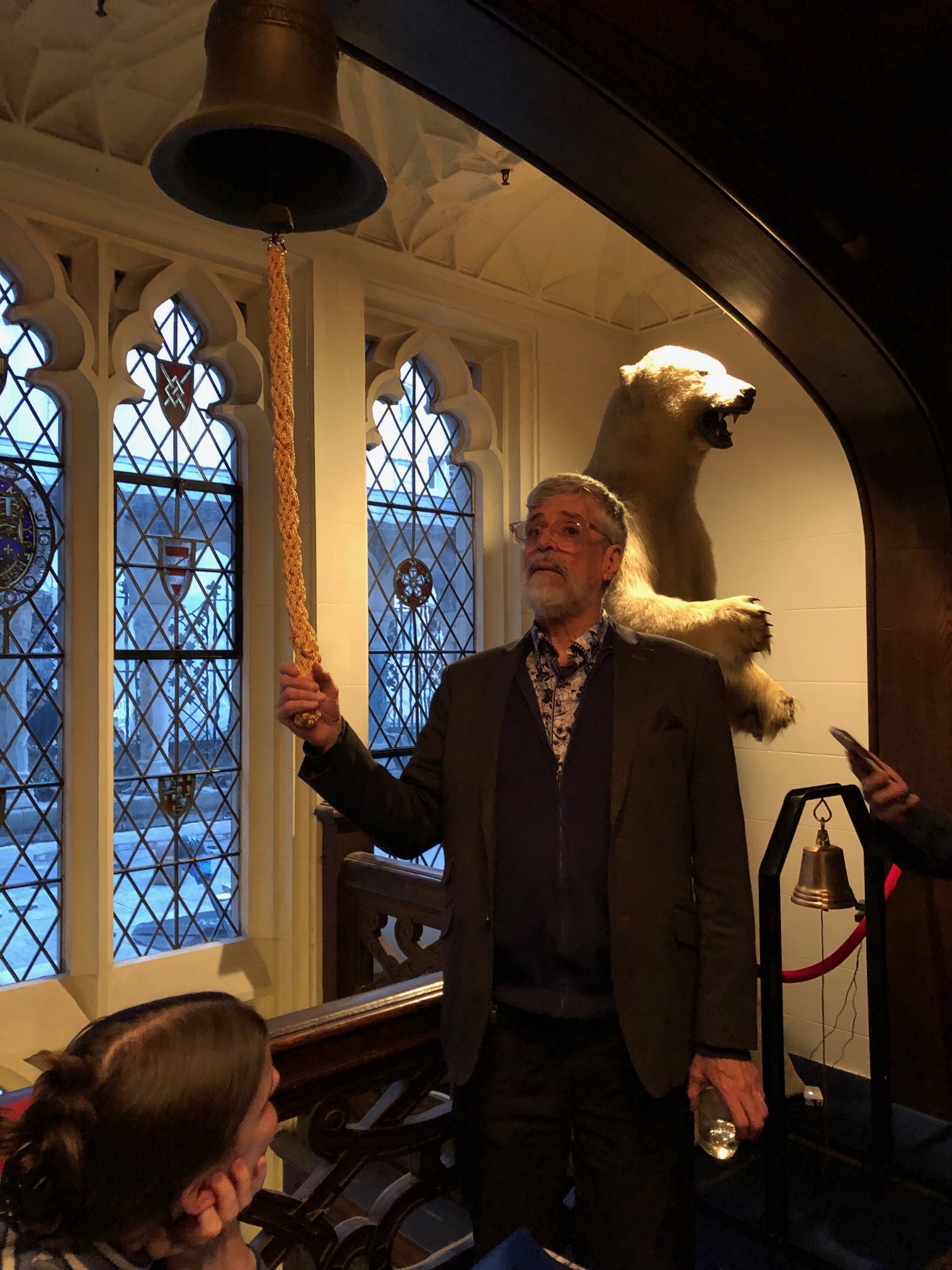 - Ken McGoogan, shadowed by a mounted polar bear, pulling on the bell rope