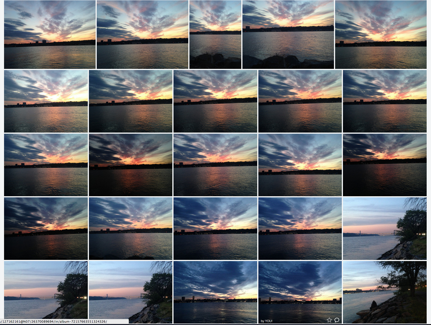 For the first time this year in NYC, the sunset fell after 8pm last night, a kind of celestial milestone on the way to the Summer Solstice June 20th. I pedaled along the Cherry Walk and took a lot of pictures down there along the Hudson River, as the daylight ebbed away, amid a prolonged symphony of color and light. Here’s a thumbnail of those photos just now added to my Flickr album that’s labeled GGB/Sunsets/Hudson. Please visit there for a full sampling of images. ![]()