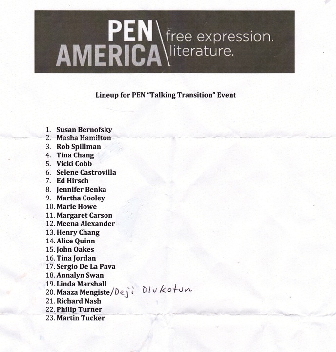 As a member of PEN America, I was invited to participate in a PEN speak-out Tuesday night that was part of Talking Transition, an event going on all week and next in Soho, providing input on policy and priorities to NYC’s incoming mayor Bill de Blasio, all citywide officeholders, and the new members of our City Council. Talking Transition is taking place in a big heated tent that’s set up on the north side of Canal Street, along Sixth Avenue. Each day this week has been devoted to a different topic–Tuesday night had an emphasis on Arts & Culture. PEN chose to devote its 90-minute slot to “Keeping NYC a literary and cultural capital.” On Twitter, you can follow transition events @TalkNYC2013 and the hashtag #TalkingTransition.