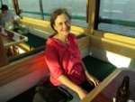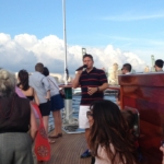 The docents have to be quick because the boats of Classic Harbor are so-called ‘motor yachts,’ and they cruise at quite good speed. The vessel we sailed on was the Manhattan II, nicely appointed with teak and mahogany and lots of clean, clear wrap-around glass. Inside was a lounge with many comfortable seats at wide tables, quite a roomy space. The copy on the brochure and map they handed out (pictured below) suggests that these NY Harbor cruises are the least crowded of all the lines offering these boat rides, and I believe it—nothing at all like being on the subway, an unfortunately apt comparison for the ride I took a couple years ago on the Circle Line. Out on deck there’s some bench seating, and enough room to walk and stand comfortably, though carefully, leaning on rails and holding on to pieces of the ship. The captain was a rather young mariner, who helmed the yacht very ably, coming to a floating rest a number of times, near the Statue of Liberty, the shore of Governors Island, the Brooklyn and Manhattan Bridges, and Battery Park City. Figured in to the price of a ticket is a free drink, so Kyle and I welcomed the discovery that Yuengling’s light beer is very drinkable!